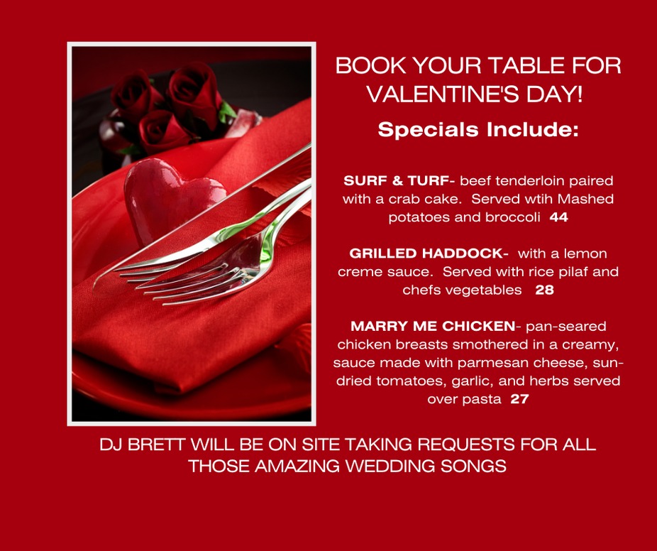 Join us on Valentine's Day for the perfect romantic evening! DJ Brett will be on site taking all your requests for those special songs! Book now !