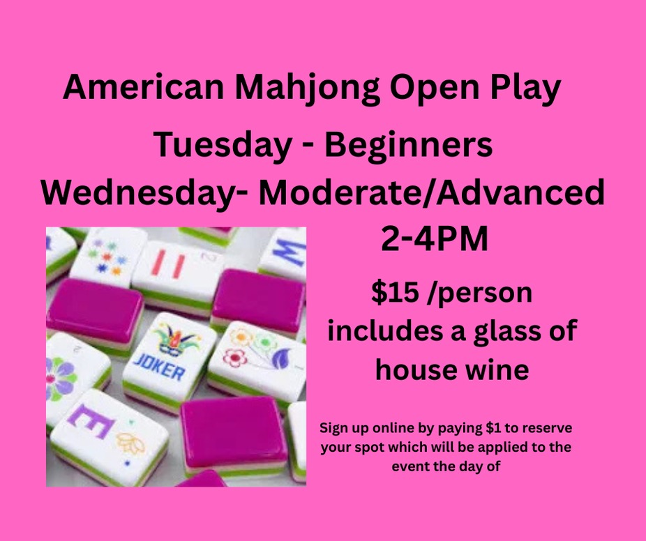 Open Play Beginner Mahjong from 2-4pm on Tuesdays. $15 to play and includes a complimentary glass of wine. Reserve your spot now for $1 which will be applied to the event the day of.